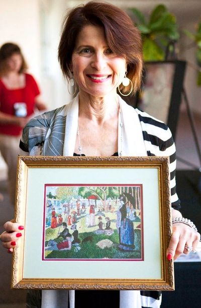 The painting I am holding here is Sunday in the Park by Seurat that I completed about ten years ago. I saw the original painting at the Art Institute in Chicago and it took my breath away. I threaded this one free-style after sketching it on cloth. In order to accomplish the shading, I employed pointillism by adding dots on top of dots in appropriate colors. The cloth became very thick and I ended up with a little thumb inflammation, but it was worth it.